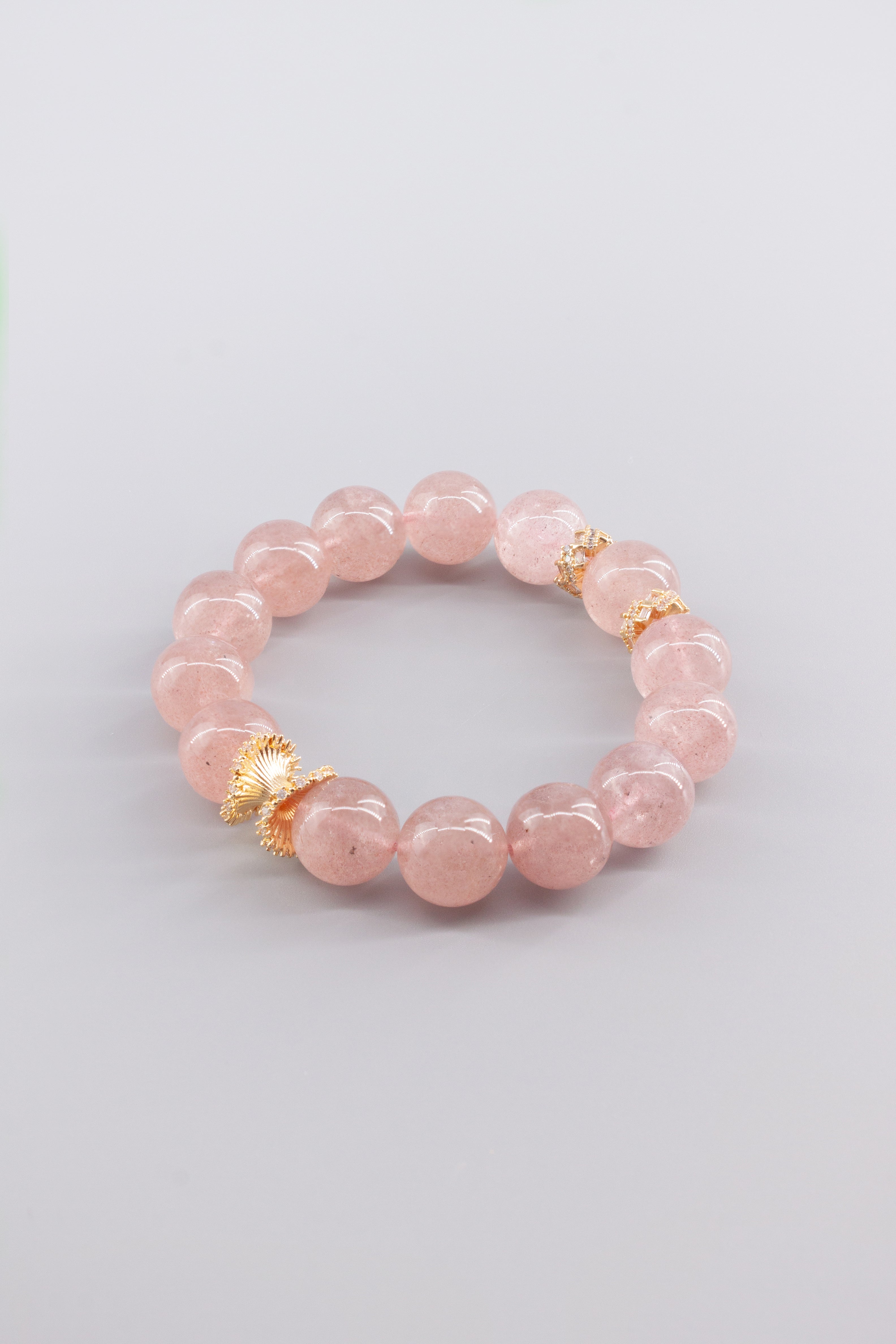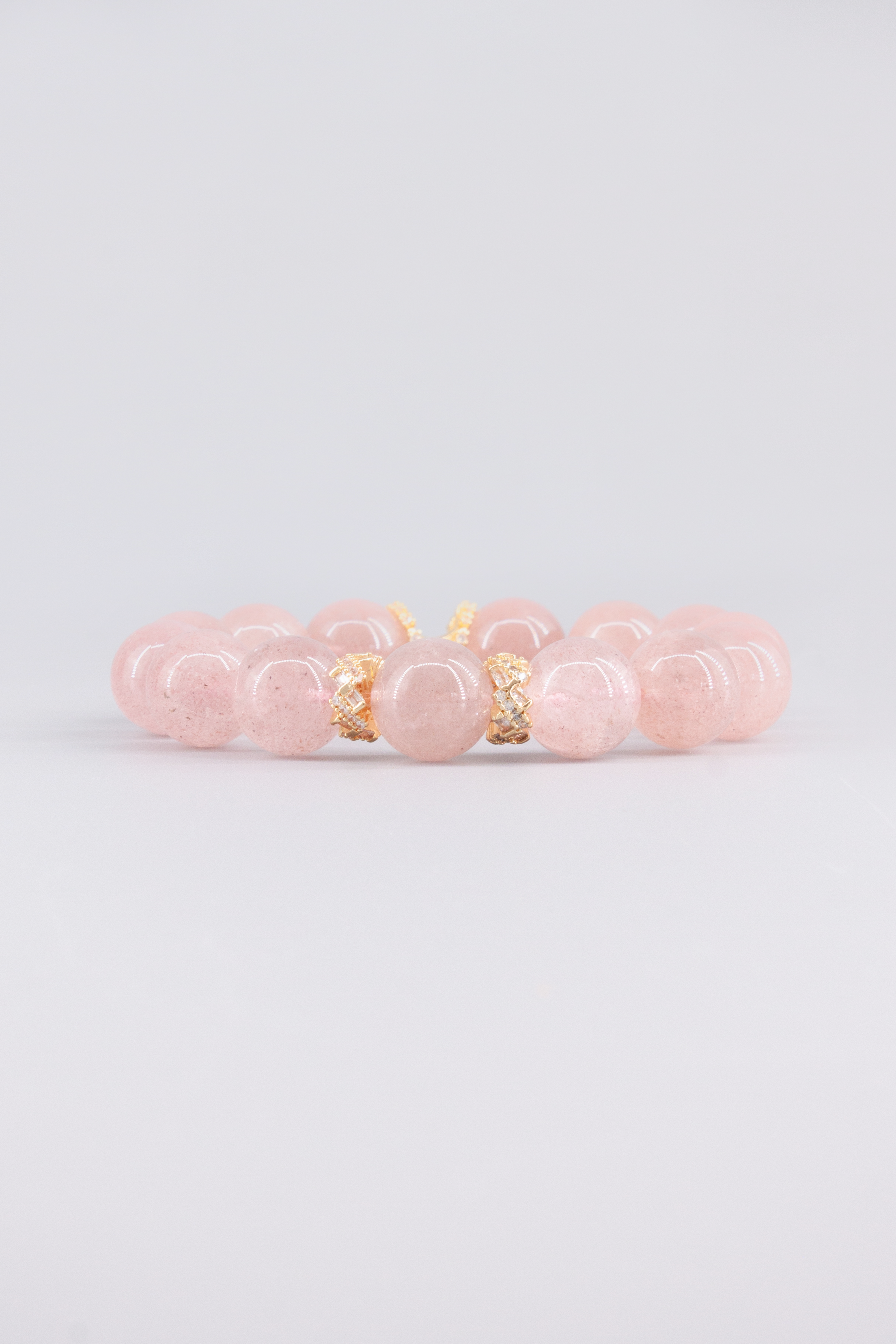 Dieses Armband wird von Hand gefertigt – aus natürlichem Erdbeerquart und langlebigem, farbbeständigem Kupfer mit spezieller Beschichtung.