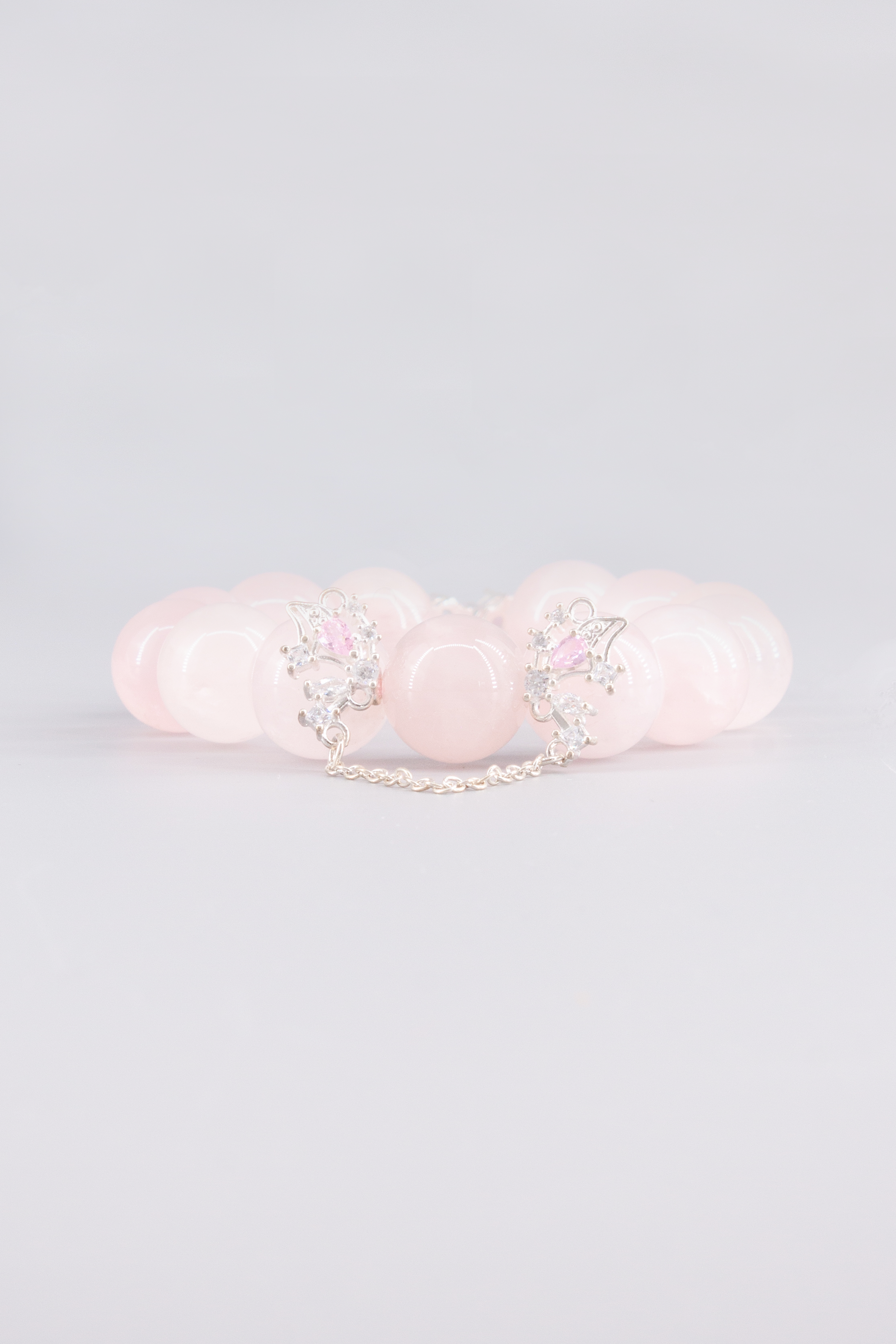 Dieses Armband wird von Hand gefertigt – aus natürlichem Rosenquarz und langlebigem, farbbeständigem Kupfer mit spezieller Beschichtung.