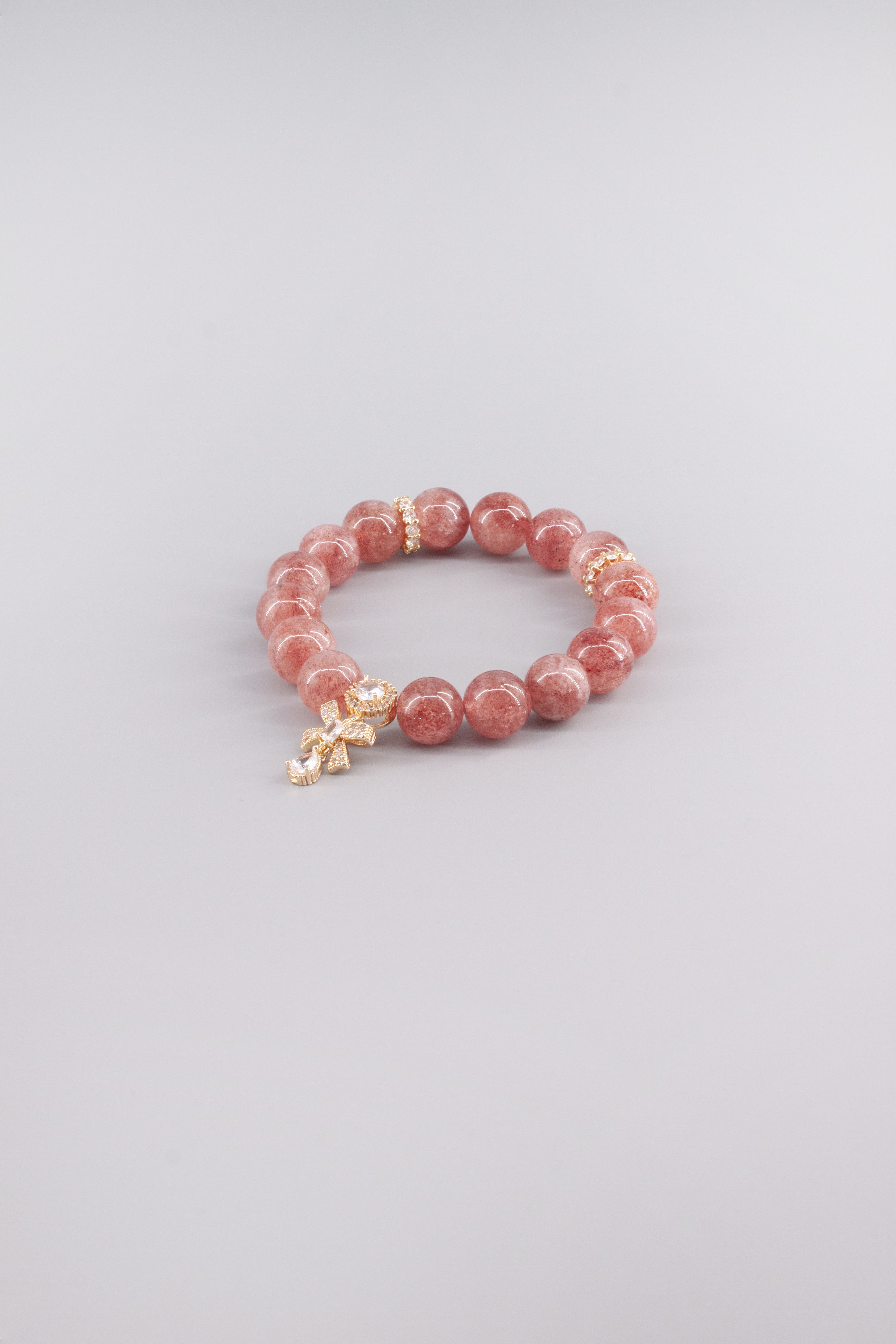 Dieses Armband wird von Hand gefertigt – aus natürlichem Erdbeerquarz und langlebigem, farbbeständigem Kupfer mit spezieller Beschichtung.